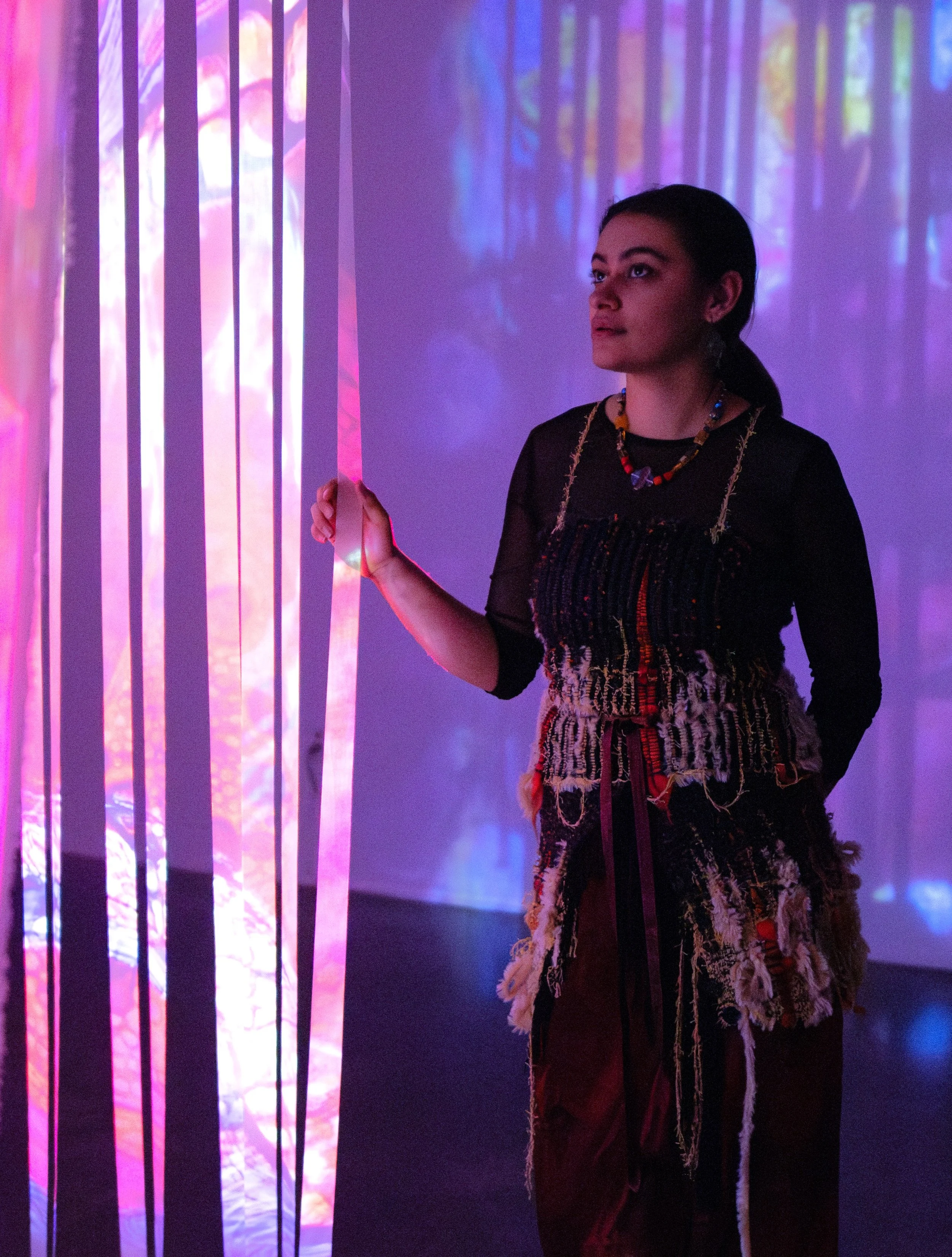 Satya Underhill Garcia is an interdisciplinary artist who grew up on the West Coast of Canada. She received a BFA with honours from the University of Victoria in 2025, and is continuing to pursue her studies at the university. Her mother is indigenous from central Mexico and her father is the 4th generation in his family of European settlers to live on SDȺY¸ES (Pender Island), where Satya grew up, the traditional territory of the WSANEC Peoples. Satya primarily works with drawing, painting, and video based mediums. Her video work often has an installation component where she uses projectors, lighting, fabric, and objects that have personal cultural significance to her, to create an immersive space. Satya has been exploring themes around change, transformation, cultural identity, and the relationship between these themes, converging as a meditation on cultural evolution. Cultural heritage and changes in cultural understandings experienced by diaspora is often a focal point in her work. Satya aims to create a place for reflection in her videos, sometimes with a more personal focus and other times diverting from the personal.