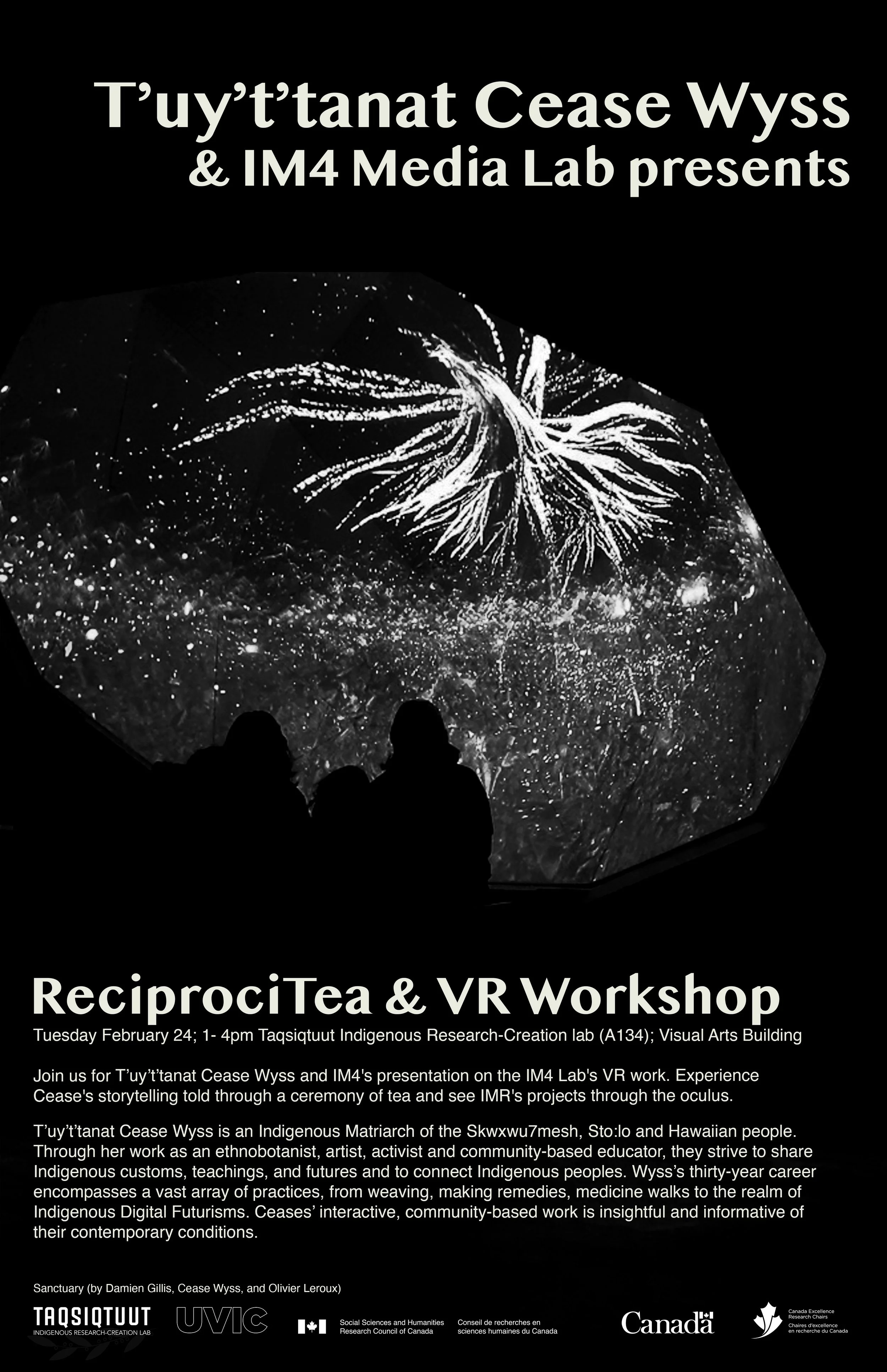 Join us for T'uy't'tanat Cease Wyss and IM4's presentation on the IM4 Lab's VR work. Experience Cease's storytelling told through a ceremony of tea and see IMR's projects through the oculus.