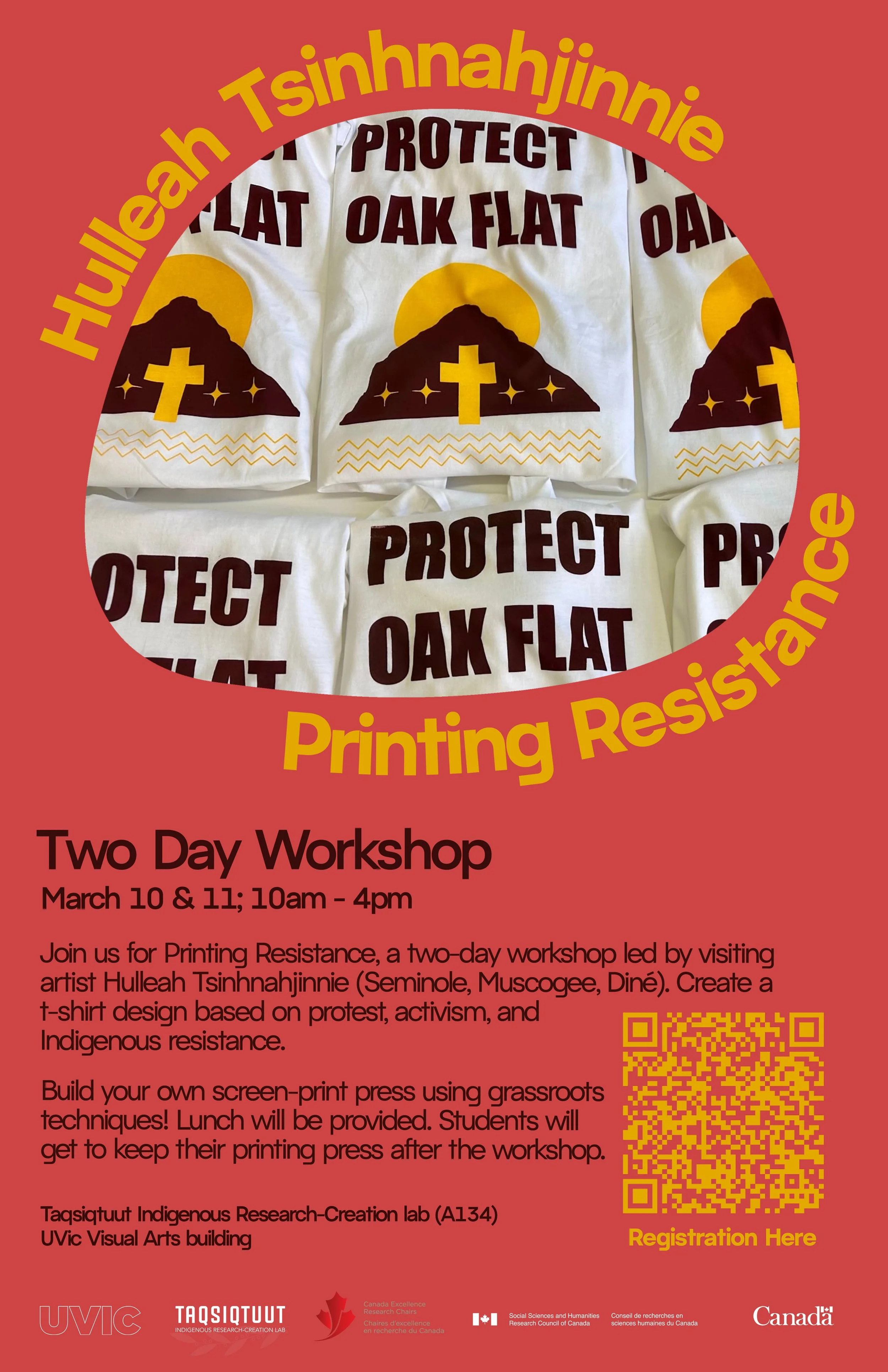 Join us for Printing Resistance, a two-day workshop led by visiting artist Hulleah Tsinhnahjinnie (Seminole, Muscogee, Diné). Create a t-shirt design based on protest, activism, and Indigenous resistance.